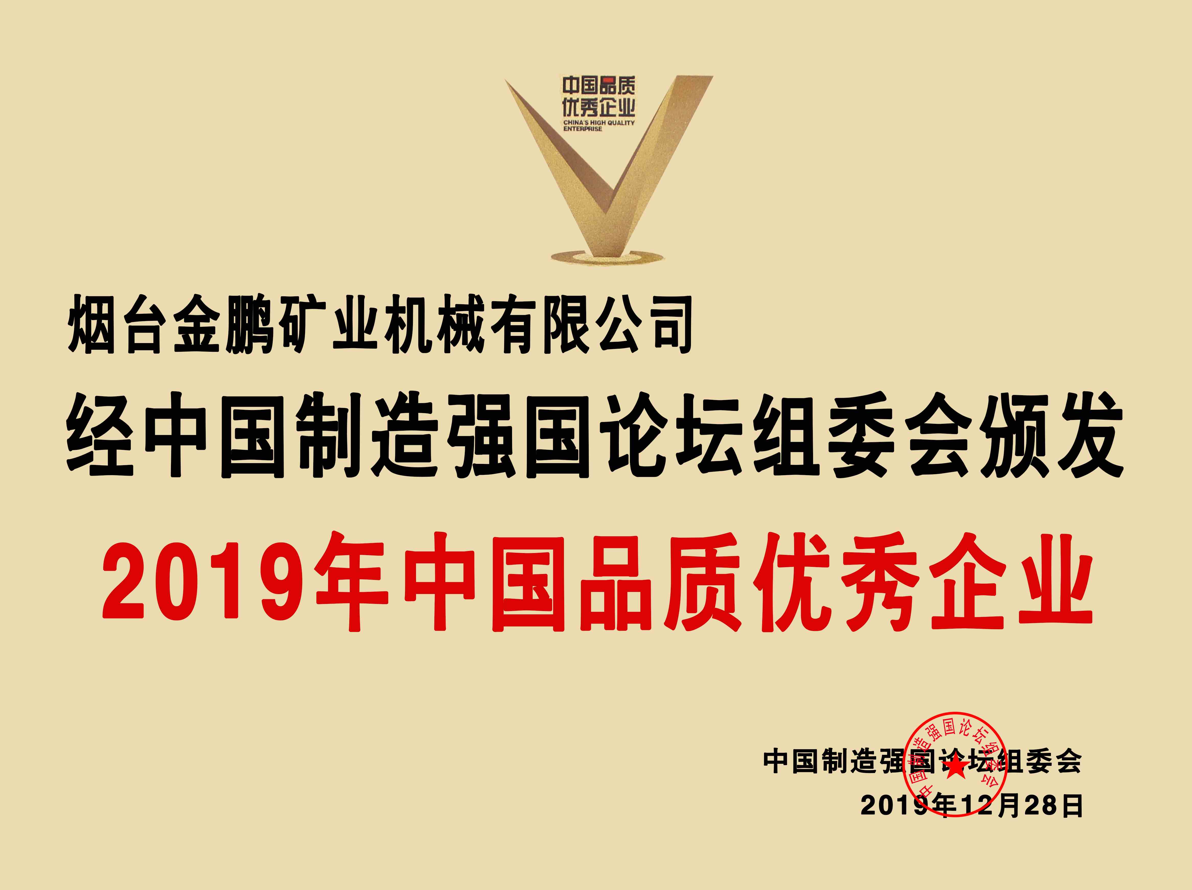 2019年中國品質(zhì)優(yōu)秀企業(yè)。